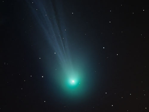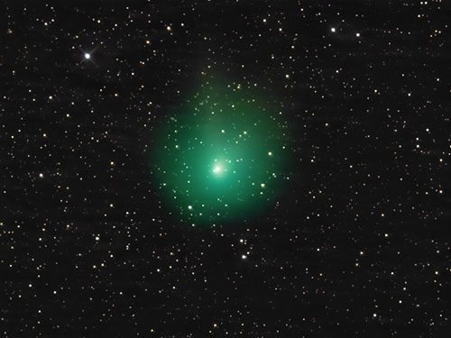 This periodic comet (T = 71 years) was discovered in 1812. It reached perihelion in April 2024, and passed 1.55 AU from Earth in June 2024. On 20 July 2023 it increased in brightness about 100 times, probably the result of an outburst that released a large amount of gas and dust. The asymmetrical outburst resulted in this peculiar horseshoe shape. A comet with horns!